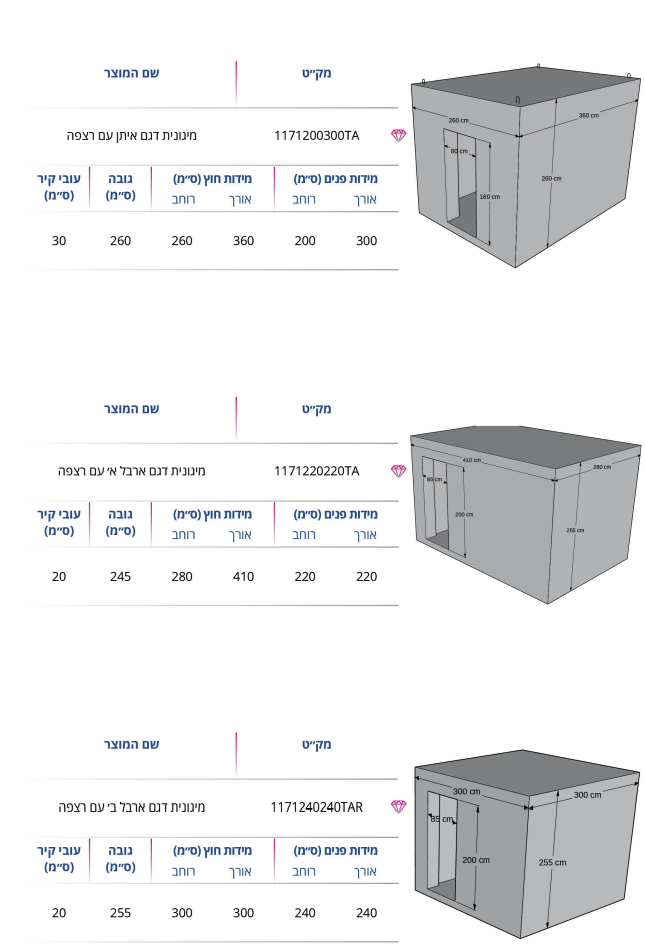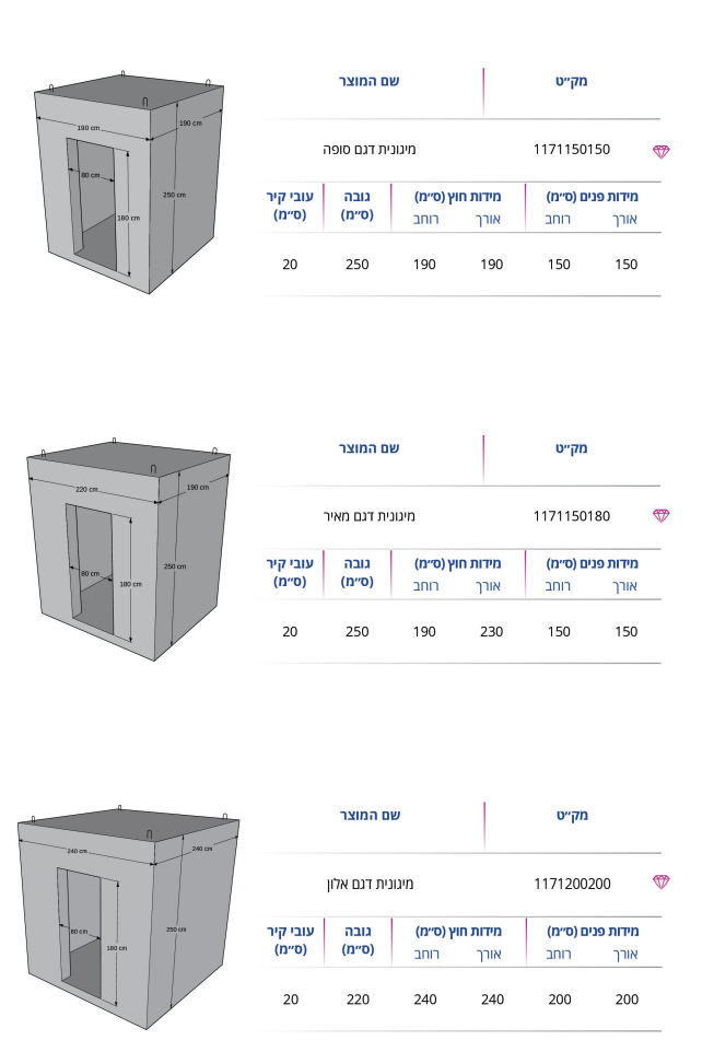 • מיגוניות (מרחבים מוגנים דירתיים) – חדרי מיגון מבטון טרומי הנפרסים כעצמאיים הניתנים להצבה בשטחים פרטיים ותעשייתיים, בהתאם לתנאי השטח והתקנות.