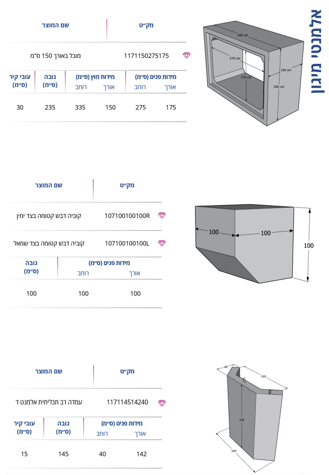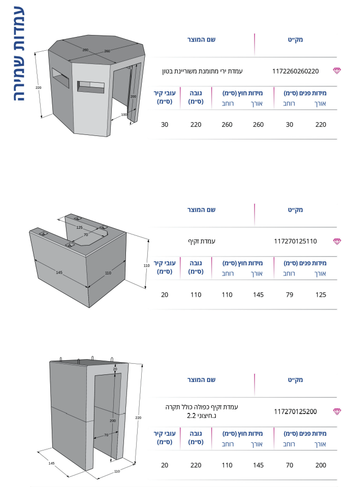 • עמדות מיגון מתקדמות – אלמנטים ייעודיים מבטון מזוין המספקים הגנה אישית לחיילים, מאבטחים ואזרחים באזורים חשופים, תוך שמירה על ניידות תפעולית וגישה לשטח. כל מוצרי המיגון מיוצרים בהתאם להנחיות פיקוד העורף ולתקנים המחמירים ביותר.